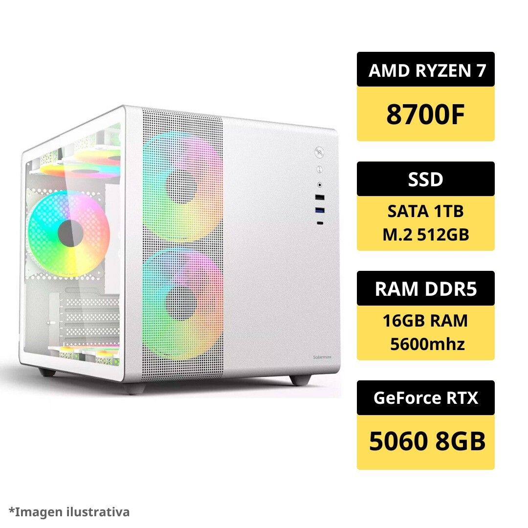 La PC Gamer AM5 es una excelente opcion para quienes buscan un equipo equilibrado y funcional. Gracias a su procesador AMD Ryzen 7 8700F, sus 16GB de RAM DDR5 5600MHz y su 1TB SSD SATA + 512GB SSD M.2 NVMe, ofrece un rendimiento agil para gaming AAA, streaming, edicion profesional y multitarea extrema. Equipado con nvidia geforce rtx 5060 8gb gddr7, es una configuracion lista para usar desde el primer dia.