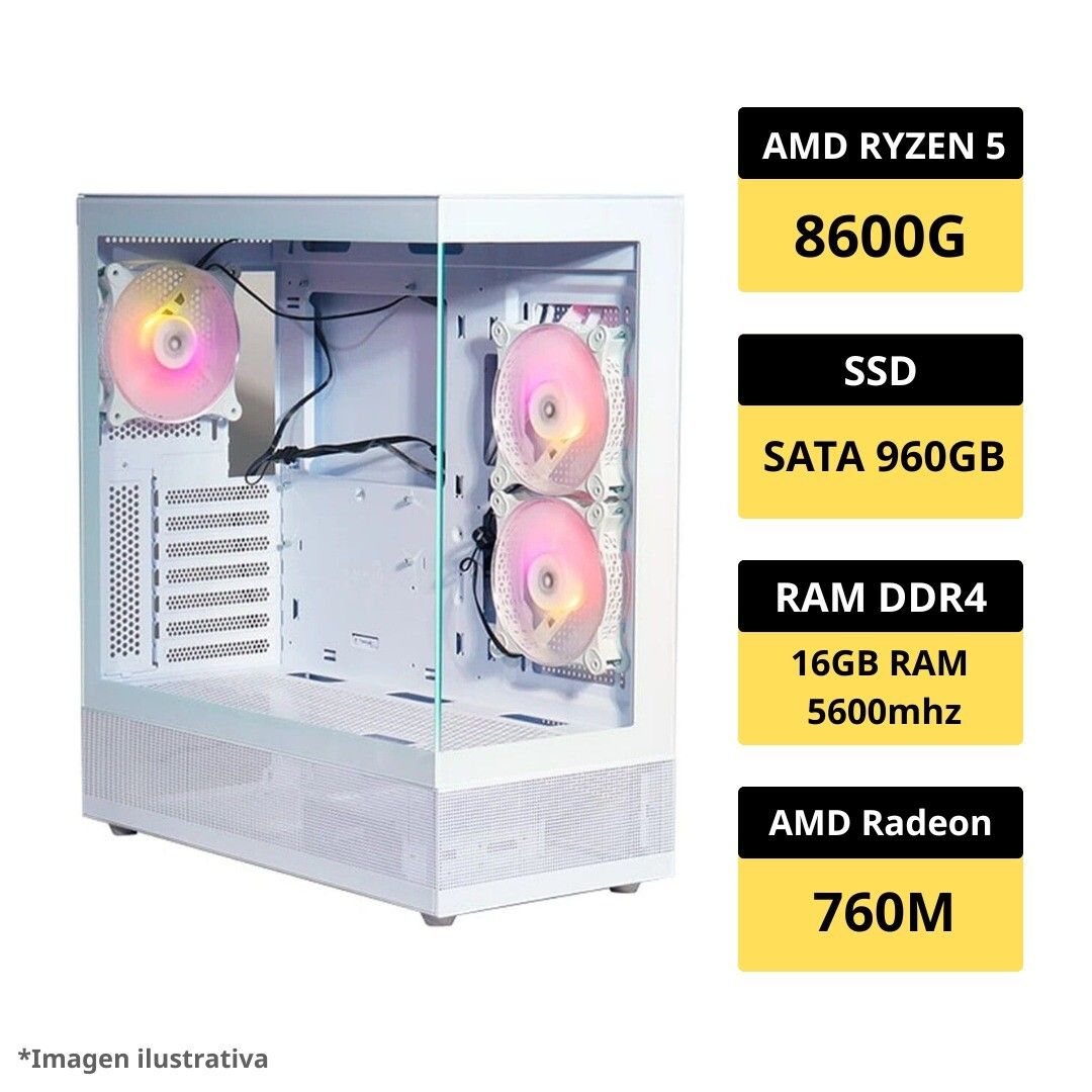 La PC Gamer es una excelente opcion para quienes buscan un equipo equilibrado y funcional. Gracias a su procesador AMD Ryzen 5 8600G, sus 16GB de RAM DDR5 5600MHz y su 960GB SSD SATA, ofrece un rendimiento agil para gaming 1080p, multimedia, multitarea y productividad. Equipado con graficos integrados amd radeon 760m (rdna 3), es una configuracion lista para usar desde el primer dia.